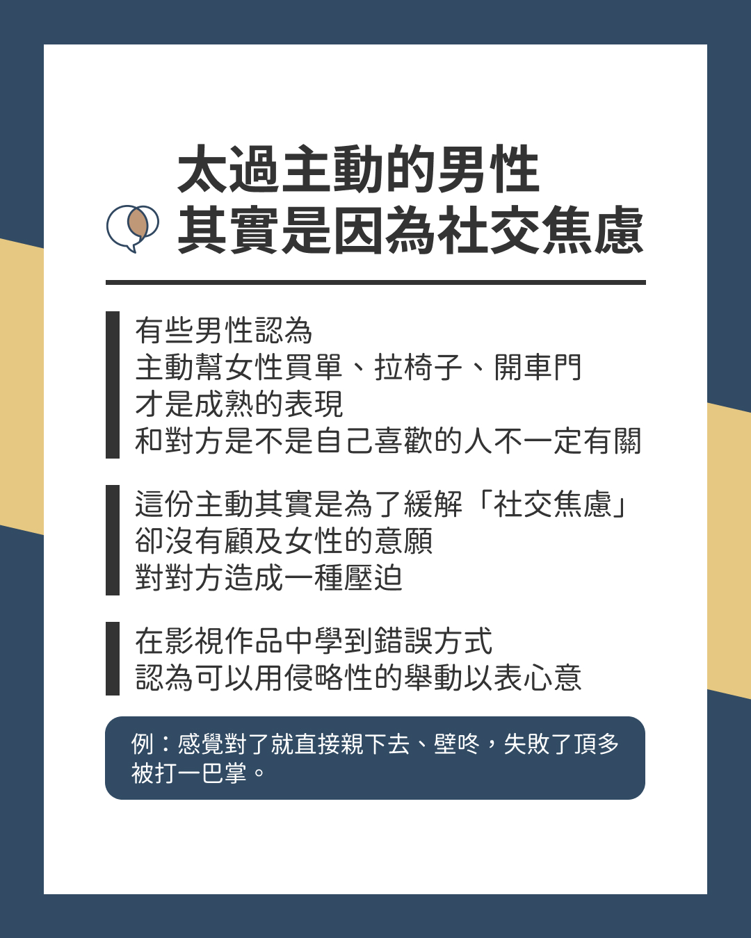 這份主動其實是為了緩解「社交焦慮」,卻沒有顧及女性的意願,對對方造成一種壓迫
