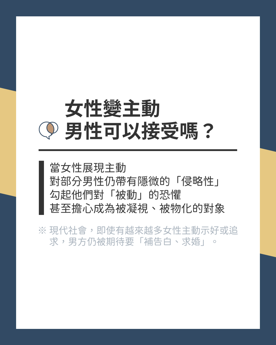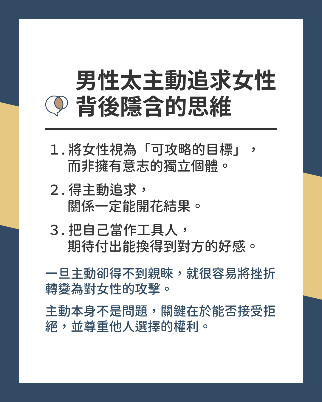 → 主動本身不是問題,關鍵在於能否接受拒絕,並尊重他人選擇的權利。