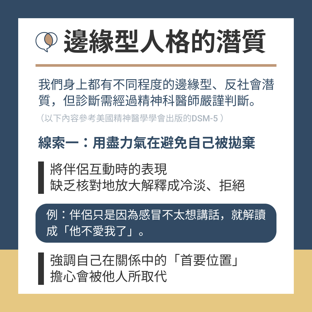 每個人身上都有不同程度的邊緣型、反社會潛質,但是要被診斷為「邊緣型人格」,需要經過精神科醫師嚴謹的判斷。
