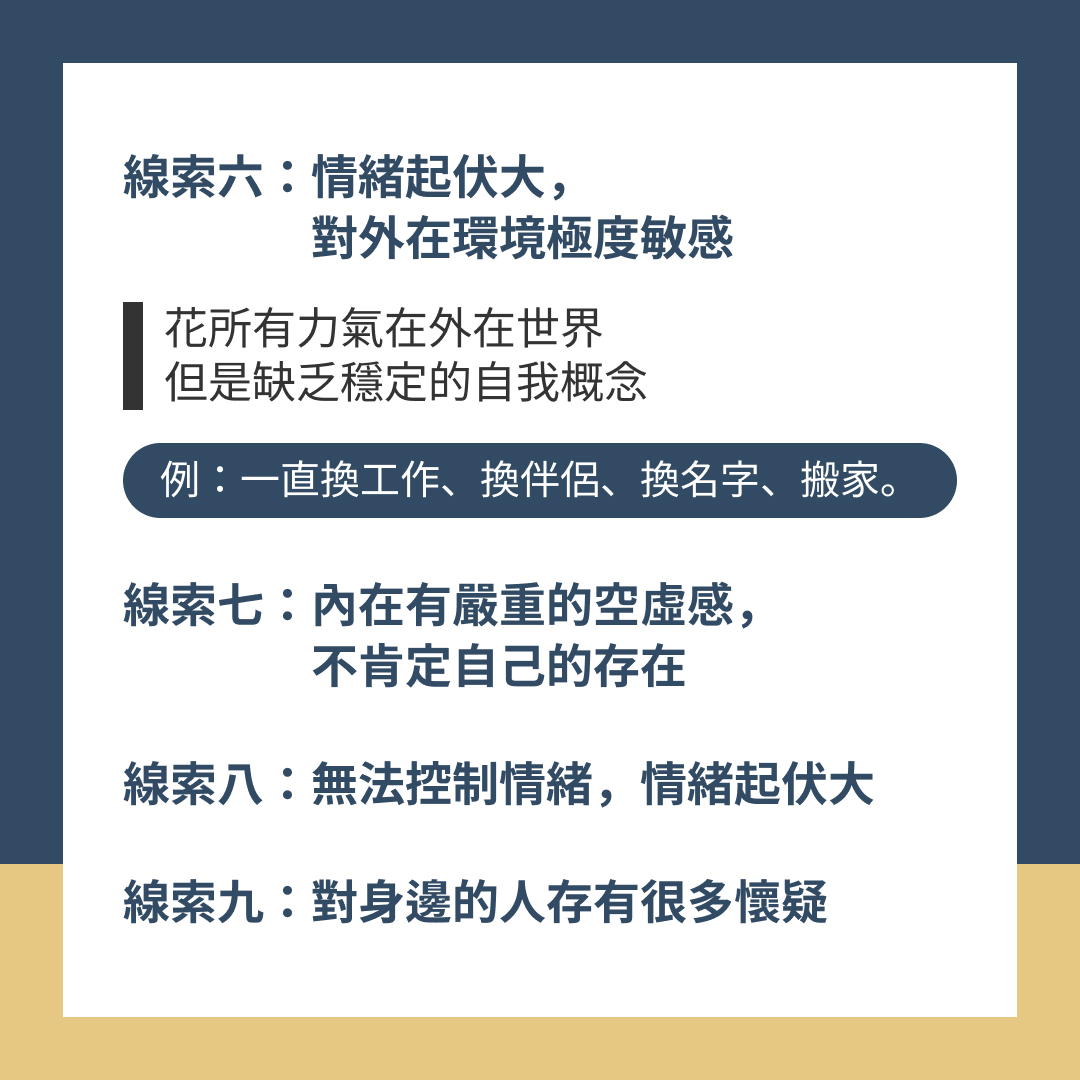 - 內在不穩定(一下很自信,一下很自卑),需要別人的陪伴或保證才能做某些事