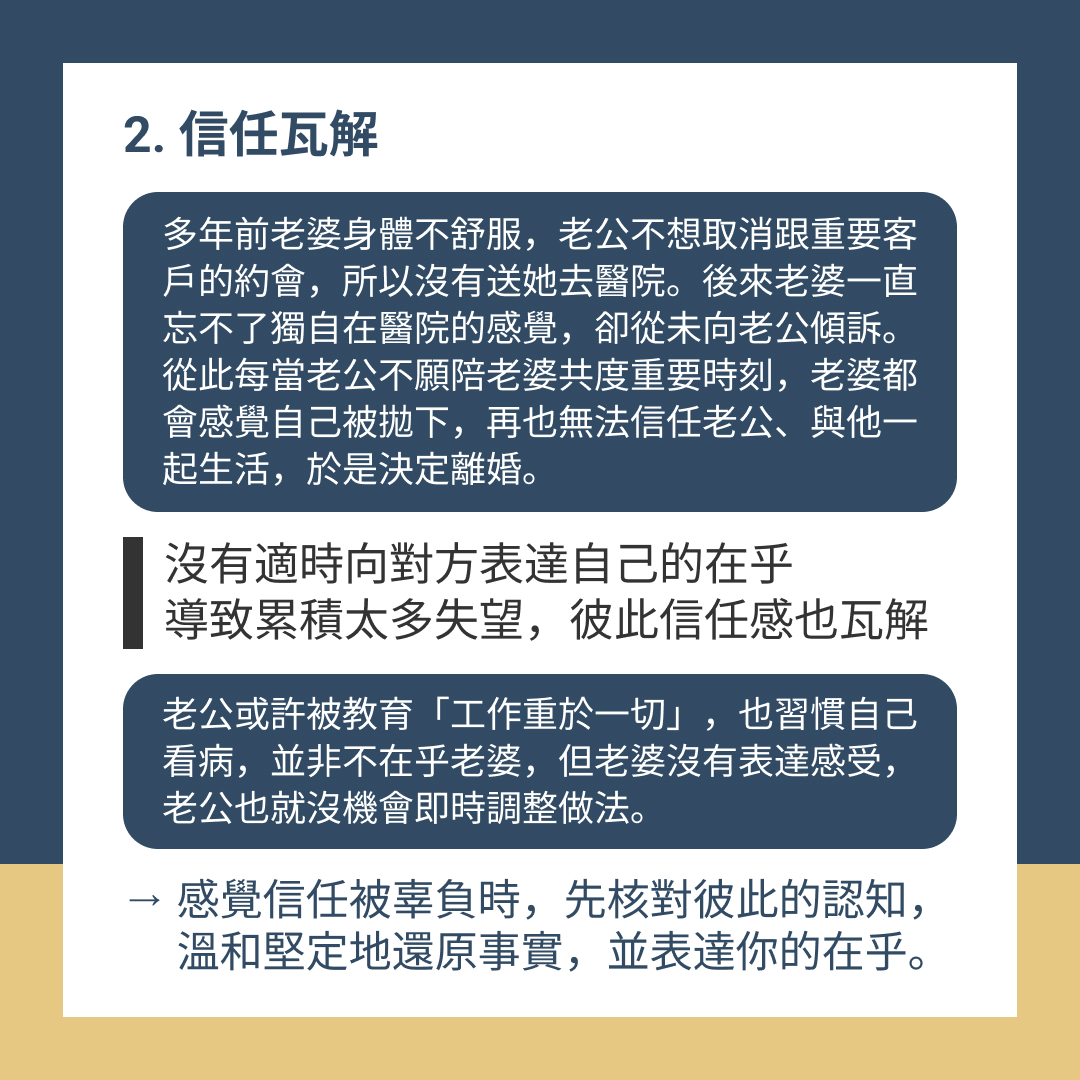 沒有適時向對方表達自己的在乎,導致累積太多失望感,彼此的信任感也瓦解