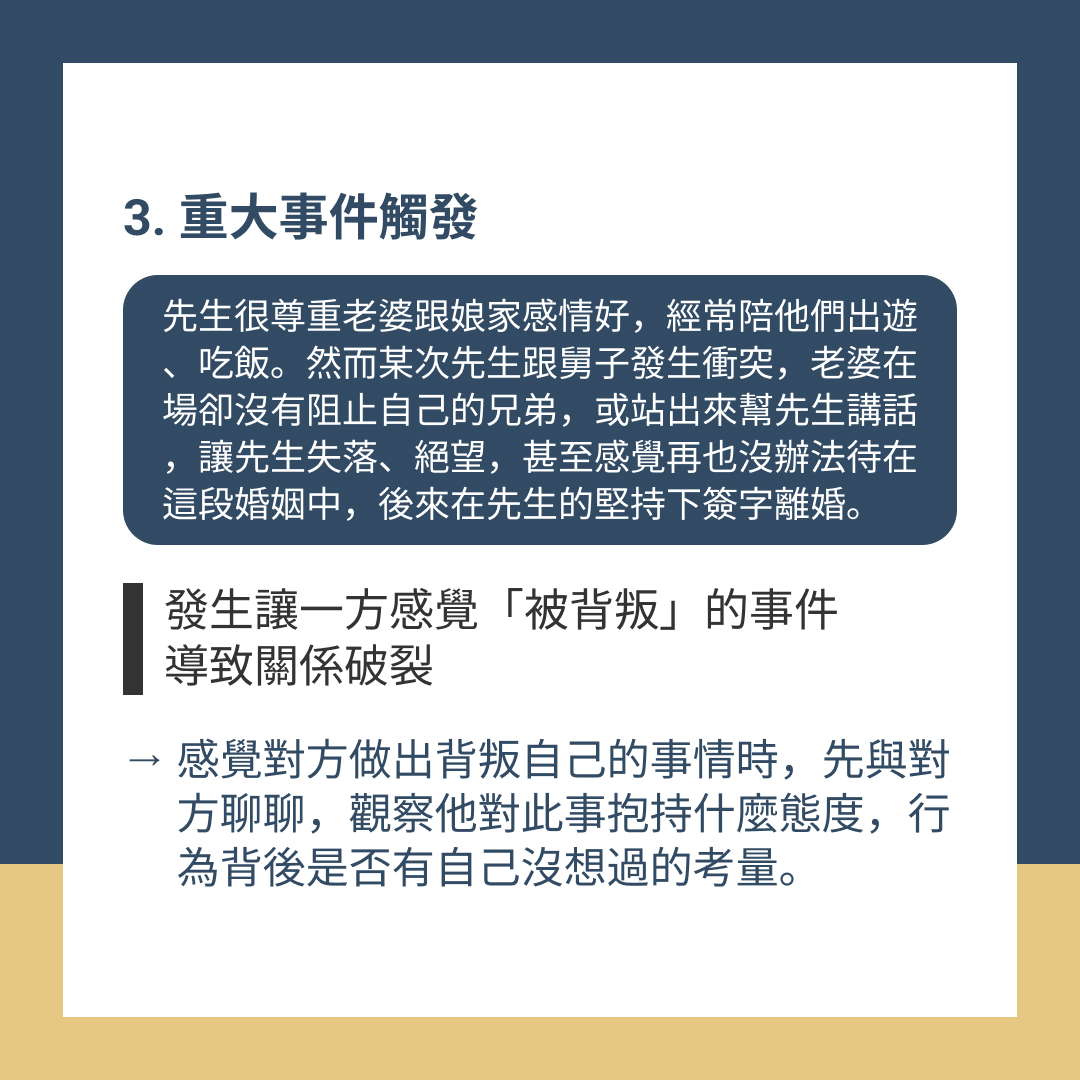 先生很尊重老婆跟娘家感情好,經常陪她們出遊、吃飯。然而某次先生跟舅子們發生衝突,老婆在場卻沒有阻止自己的兄弟,或站出來幫先生講話,讓先生非常失落、絕望,甚至感覺再也沒辦法待在這段婚姻中。後來在先生的堅持下,兩人簽字離婚。
