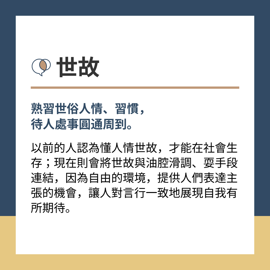 世故:熟習世俗人情、習慣,待人處事圓通周到