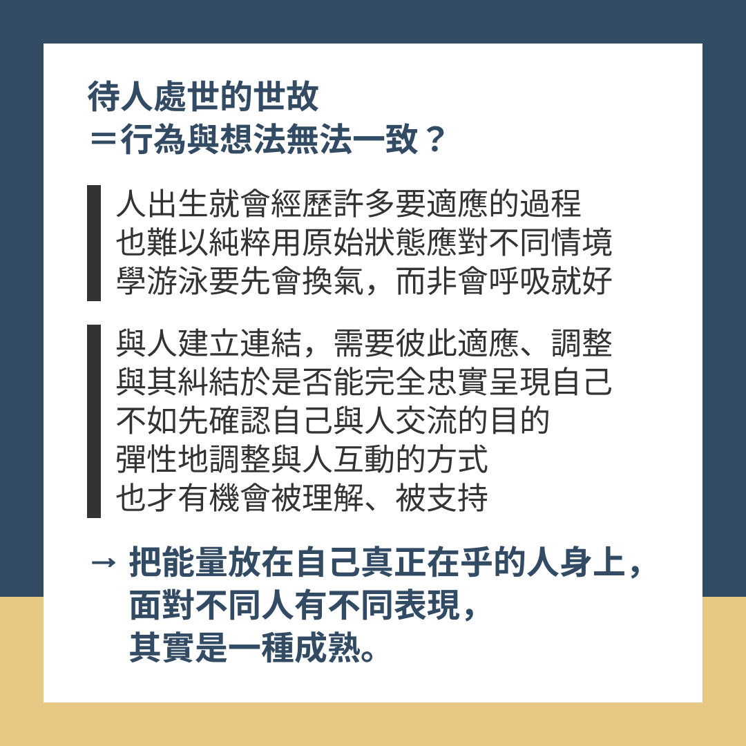 與人建立連結,本就需要彼此適應、調整,與其糾結於是否能完全忠實呈現自己,不如先確認自己與人交流的目的,彈性地調整與人互動的方式,也才有機會被理解、被支持
