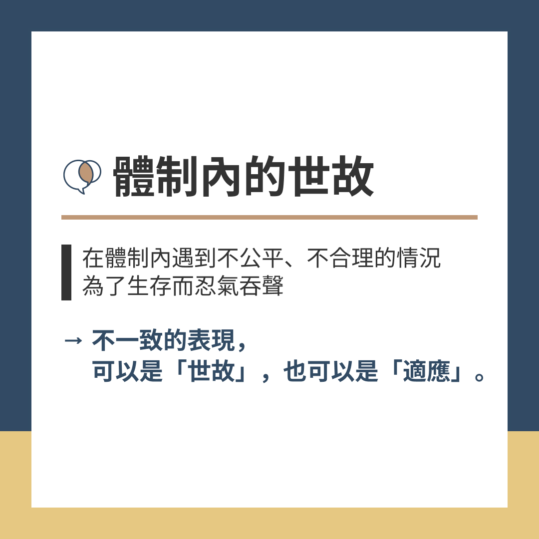 → 不一致的表現,可以是「世故」,也可以是「適應」。