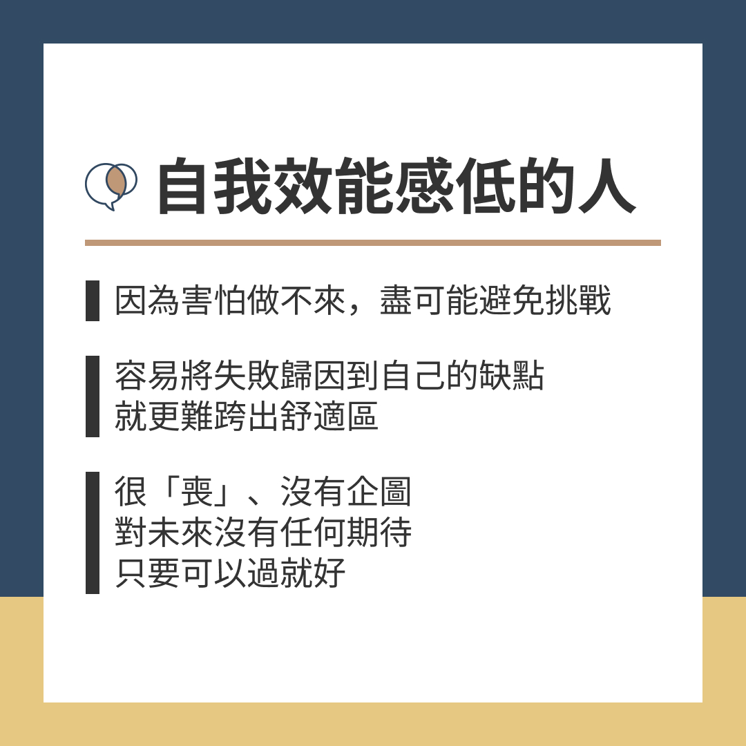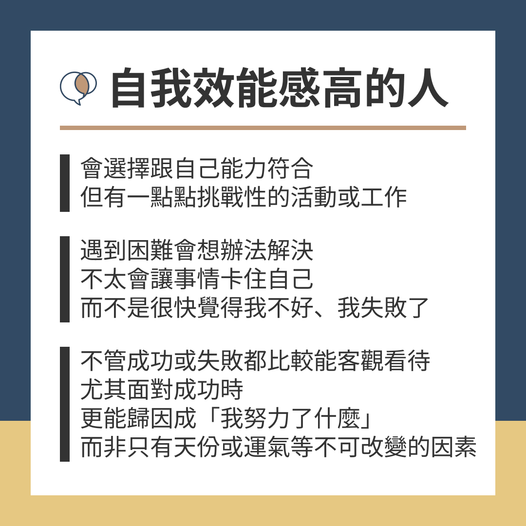 對於自己能完成某個任務或工作,你主觀覺得自己做得來、做得好,表示你有一個好的自我效能。