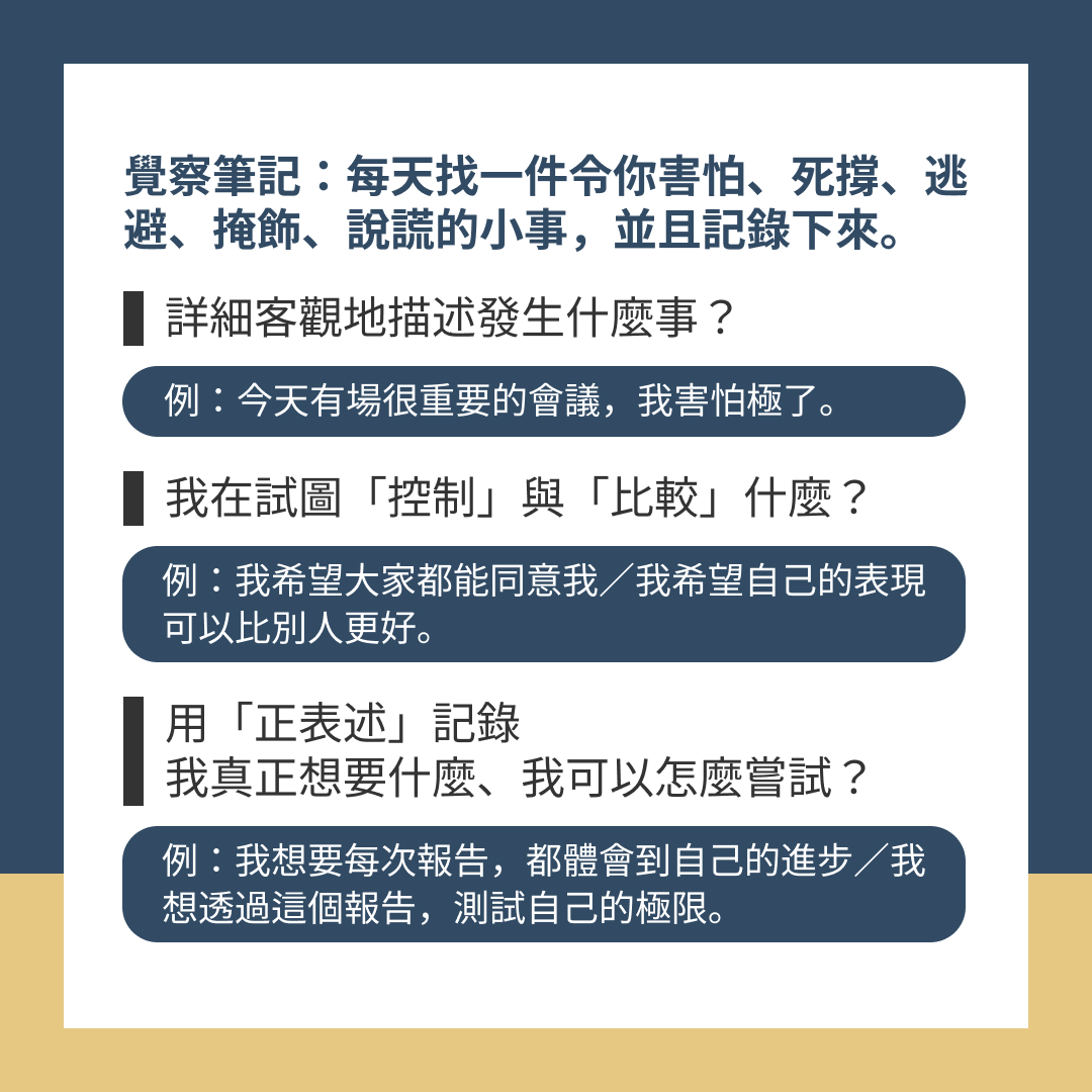→ 覺察筆記~每天找一件令你害怕、死撐、逃避、掩飾、說謊的小事,並且記錄下來: