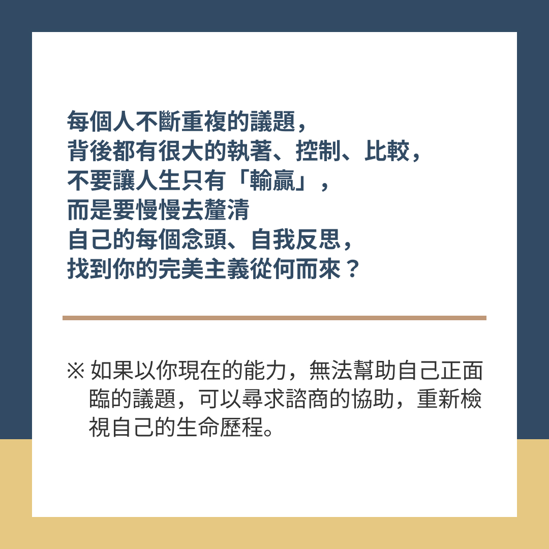 每個人不斷重複的議題,背後都有很大的執著、控制、比較,不要讓人生只有「輸贏」,而是要慢慢去釐清自己的每個念頭、自我反思,找到你的完美主義從何而來?