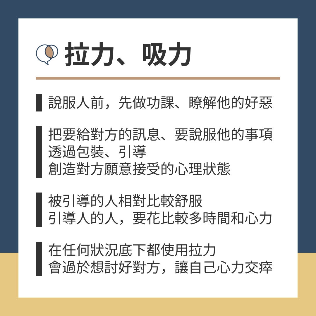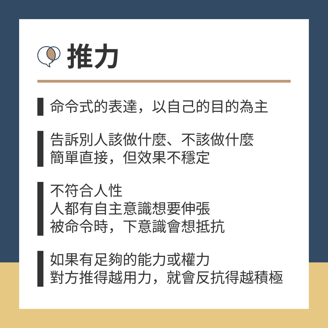 推力、拉力、壓力在溝通和說服中都可以使用,什麼時候用什麼方法的關鍵是「思考」