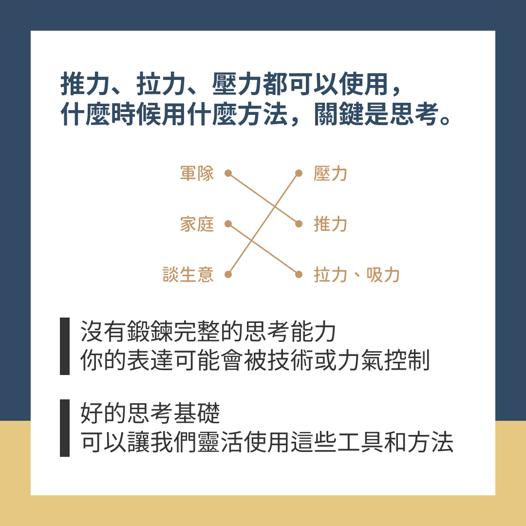 好的思考基礎,能讓你靈活使用這些工具(拉力、推力、壓力)