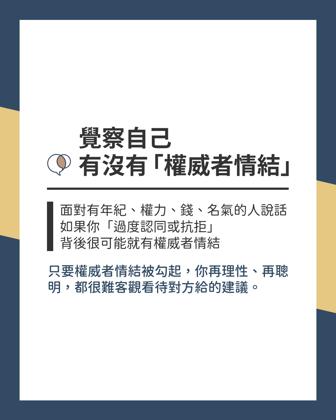 如果你面對有年紀、有權力、有錢、有名的人說的話,不是「過度認同」,就是「過度抗拒」,背後很可能有權威者情結。只要權威者情結被勾起,你再理性、再聰明,都很難客觀看待對方給的建議