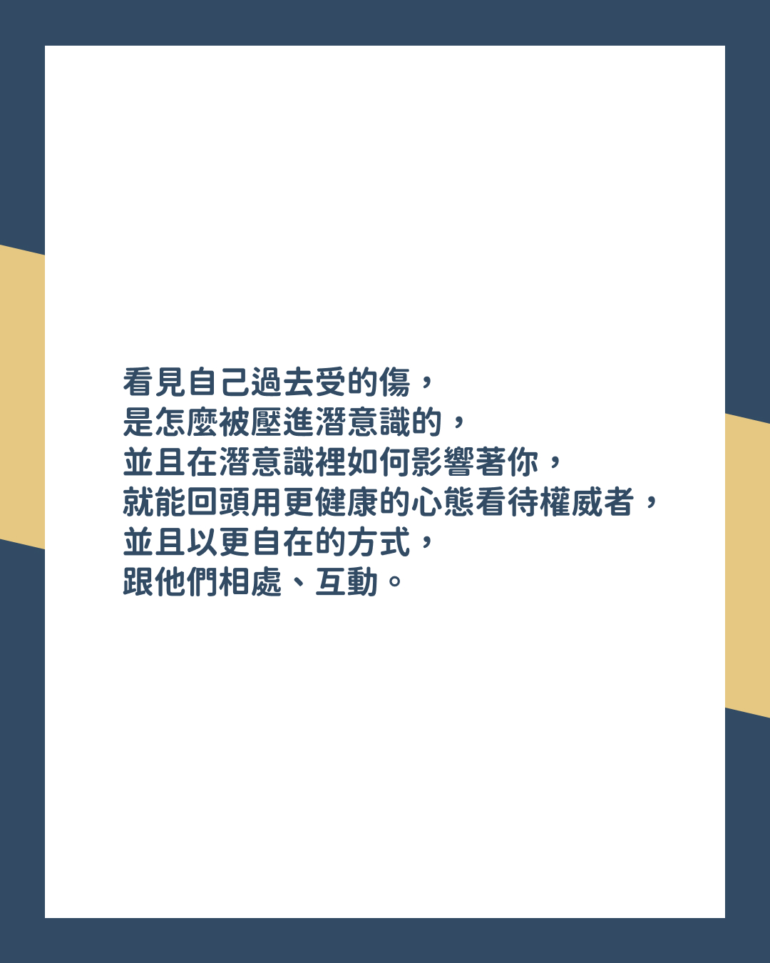 看見自己過去受的傷,是怎麼被壓進潛意識,並且在潛意識裡影響著你,就能回頭用更健康的心態看待權威者,並且以更自在的方式跟他們相處、互動: