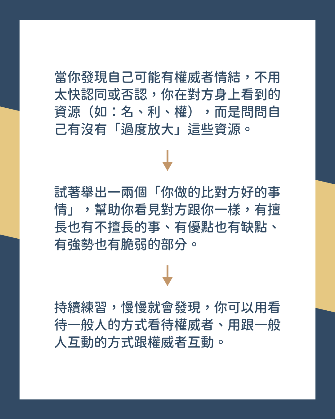 當你發現自己可能有權威者情結,不用太快認同或否認你在對方身上看到的資源(如:名、利、權),而是問問自己有沒有「過度放大」這些資源。
