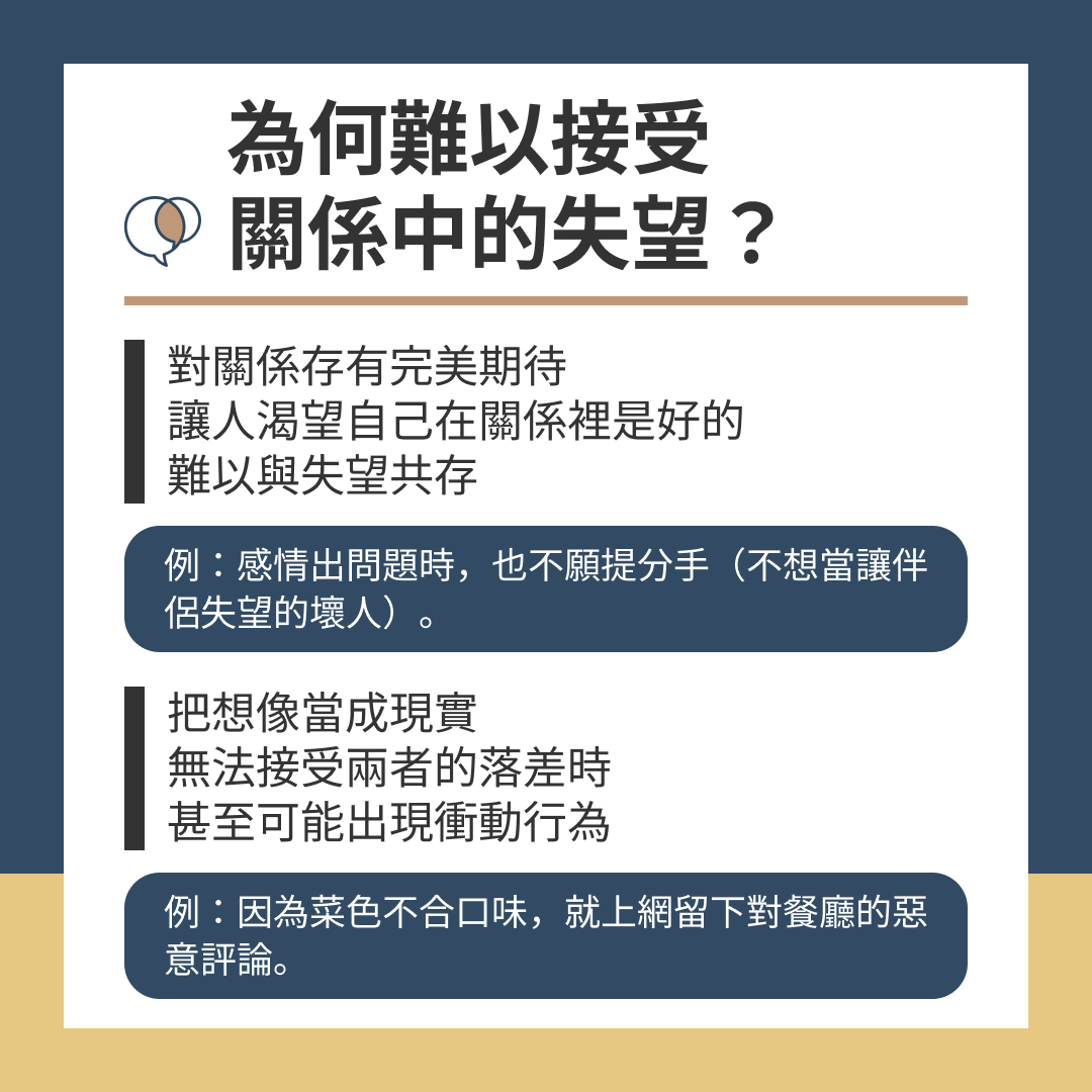 因為擔心「失望等於關係破裂」,為了避免失望,對自己抱有完美要求,反而會為關係帶來壓力