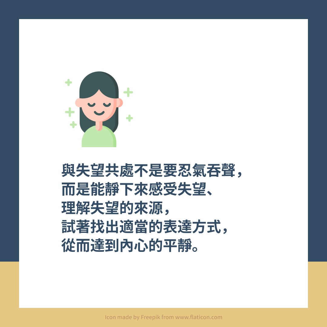 → 與失望共處不是要忍氣吞聲,而是能靜下來感受失望、理解失望的來源,試著找出適當的表達方式,從而達到內心的平靜。