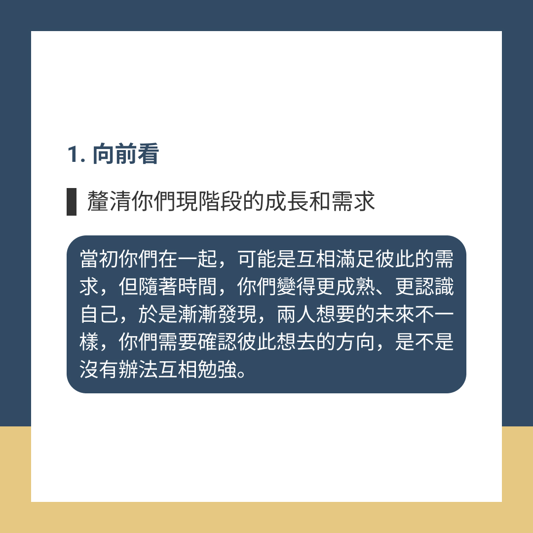 當初在一起,你們可能互相滿足彼此的需求,但隨著時間,你們變得更成熟、更認識自己,於是漸漸發現兩人想要的未來不一樣,你們需要確認彼此想去的方向,是不是沒有辦法互相勉強。
