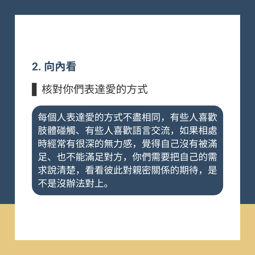 每個人表達愛的方式不盡相同,有些人喜歡肢體碰觸、有些人喜歡語言交流,如果相處時經常有很深的無力感,覺得自己沒有被滿足、也不能滿足對方,你們需要把自己的需求說清楚,看看彼此對親密關係的期待,是不是沒辦法對上。