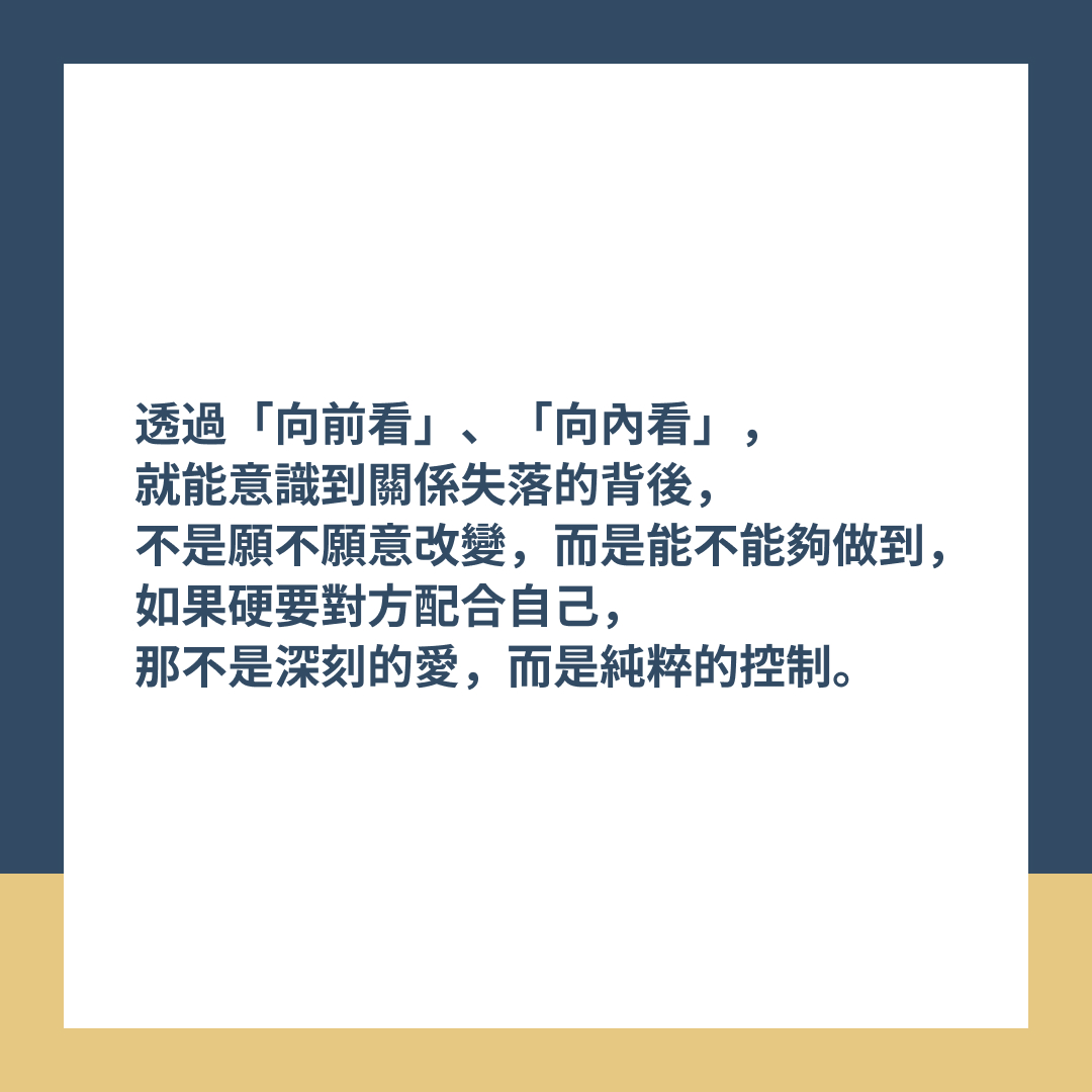 透過「向前看」、「向內看」,就能意識到關係失落的背後,不是願不願意改變,而是能不能夠做到,如果硬要對方配合自己,那不是深刻的愛,而是純粹的控制。