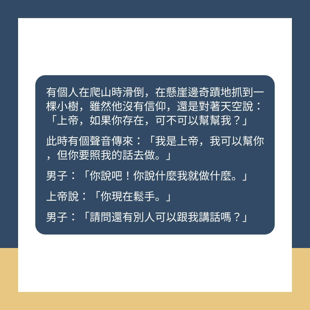 有個人在爬山時滑倒,在懸崖邊奇蹟地抓到一棵小樹,雖然他沒有信仰,卻對著天空說:「上帝,如果你存在,可不可以幫幫我?」此時有個聲音傳來:「我就是上帝,我可以幫你,但你要照我的話去做。」男子回答:「你說吧!你說什麼我就會做什麼。」,上帝:「你現在鬆手。」男子:「請問還有別人可以跟我講話嗎?」
