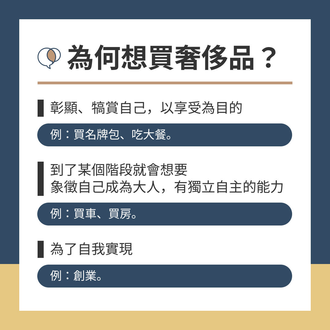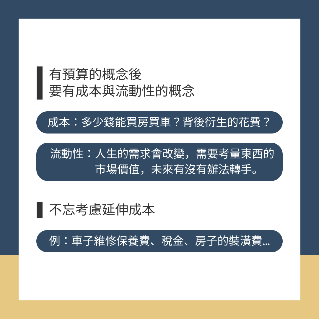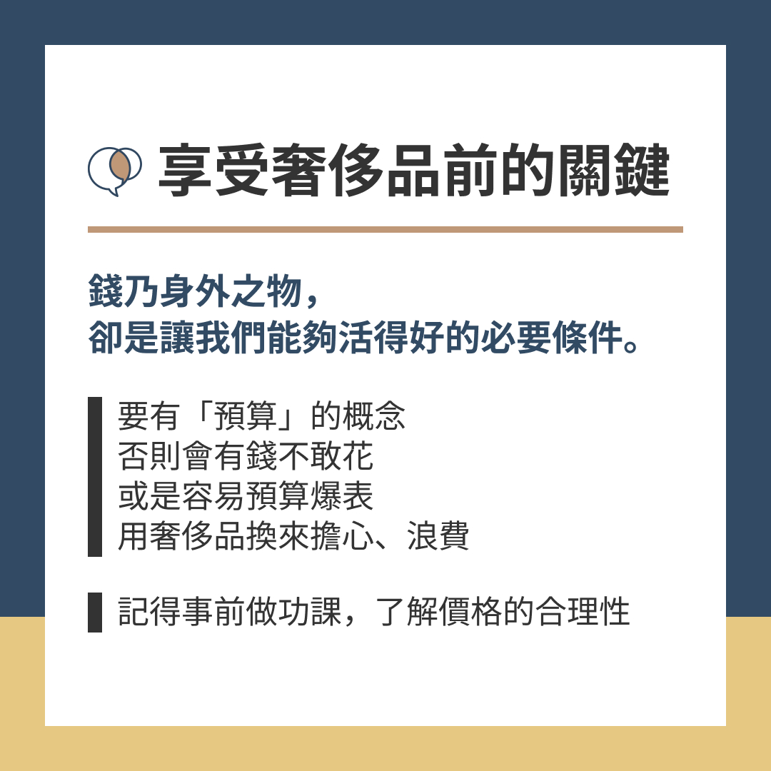 - 要有「預算」的概念,否則有錢不敢花,或是容易預算爆表,用奢侈品換來擔心、浪費