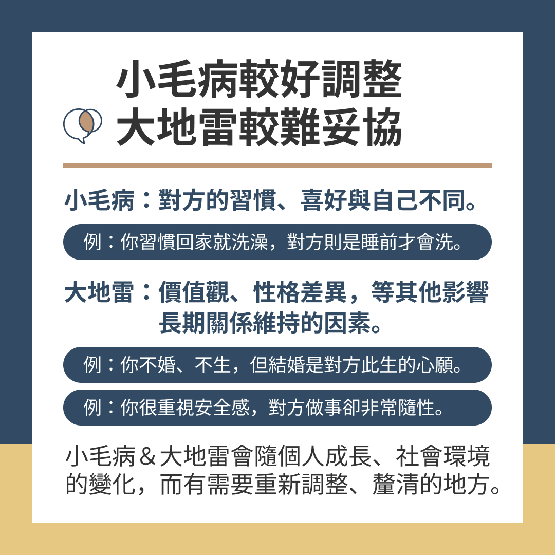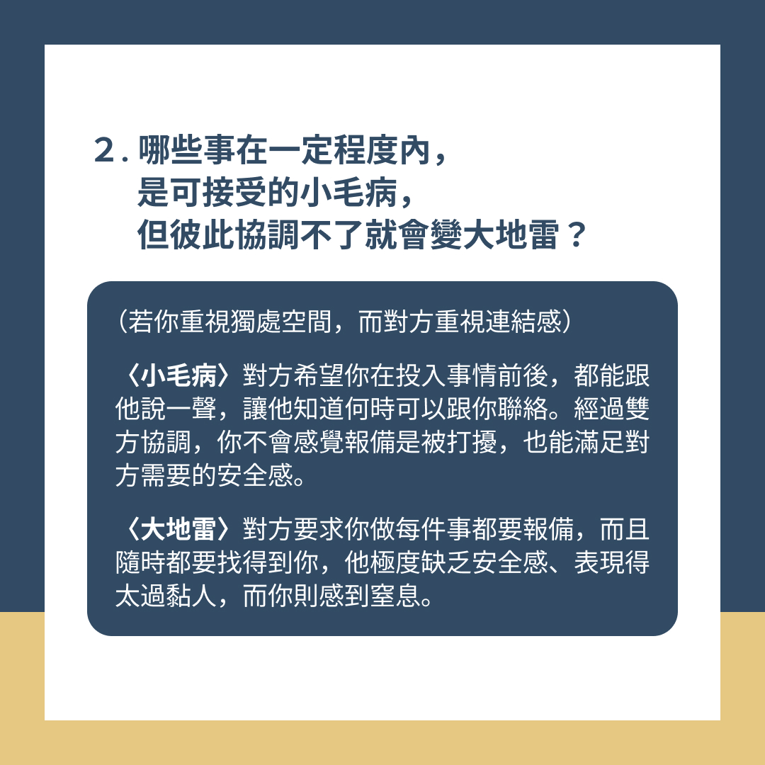 2. 有哪些事,在一定程度內是可接受的「小毛病」,但彼此協調不了就會變「大地雷」?