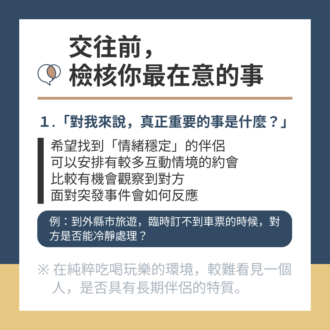 → 正式進入交往前,多給彼此一點互相認識的空間,才可能把握住適合的對象。