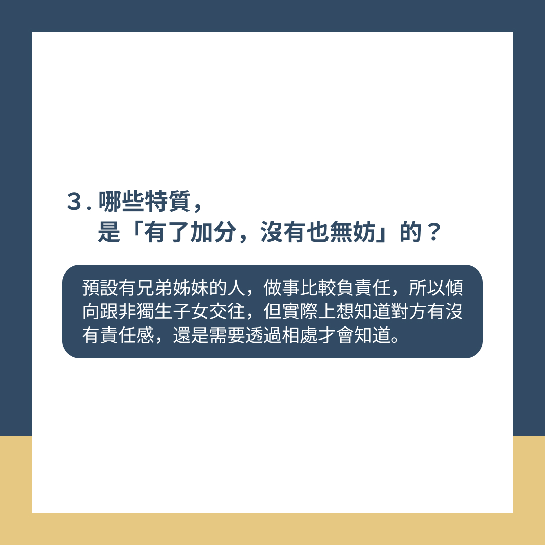 預設有兄弟姊妹的人,做事比較負責任,所以傾向跟非獨生子女交往,但實際上想知道對方有沒有責任感,還是需要透過相處才會知道。
