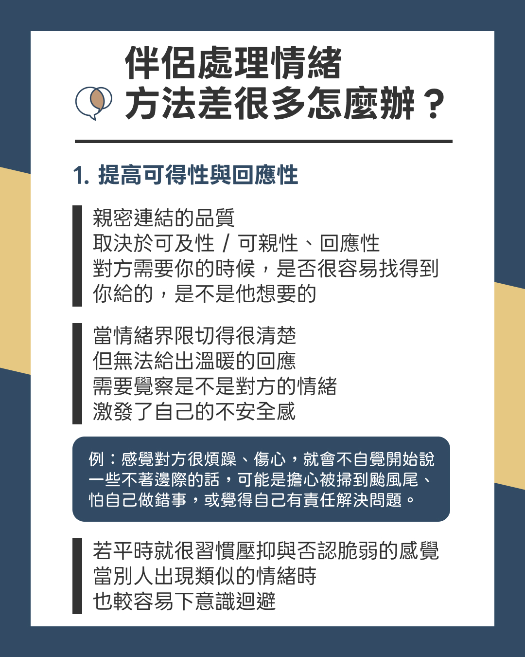 陪伴對於情緒比較陌生的伴侶時,可以透過閱讀書籍或收聽Podcasts,學習相關的「情緒回應技巧」。當對方在分享感受的時候,就能協助他命名這些複雜的情緒,讓情緒能量獲得釋放,而不只是總想著要幫他解決問題,卻讓對方覺得被批評、沒有被接住(小豪)