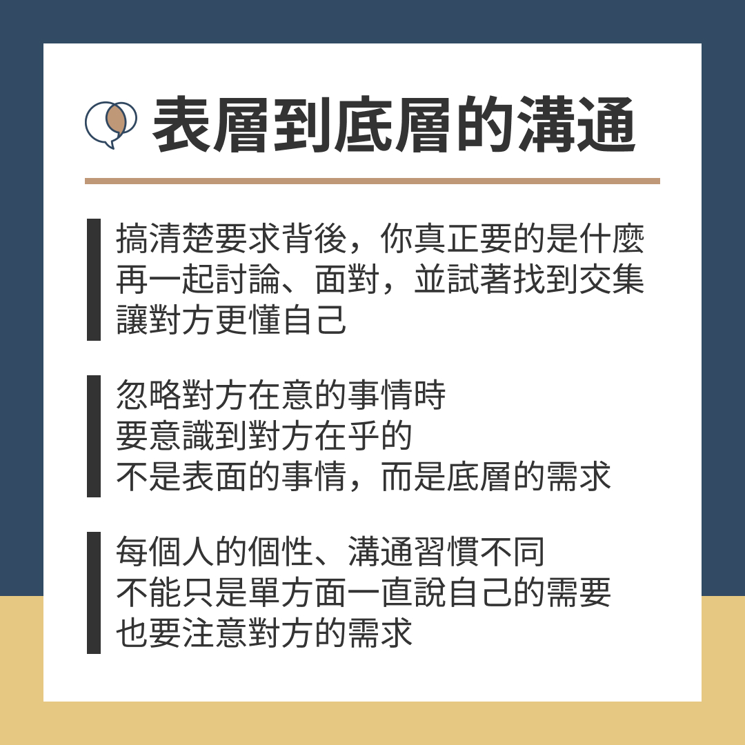 搞清楚要求的背後,自己真正想要的是什麼,再一起討論、面對,並試著找到交集,讓對方更懂自己