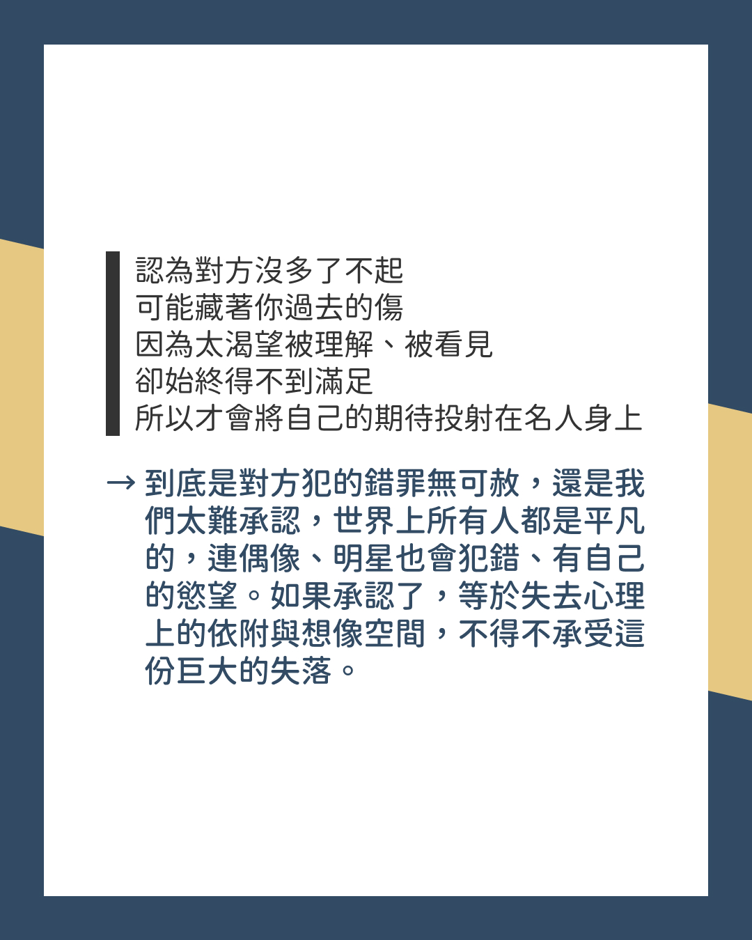 → 到底是對方犯的錯罪無可赦,還是我們太難承認世上所有人都是平凡的,連偶像、明星也會犯錯、有自己的慾望?但這樣等於失去心理上的依附與想像空間,不得不承受這份巨大的失落。