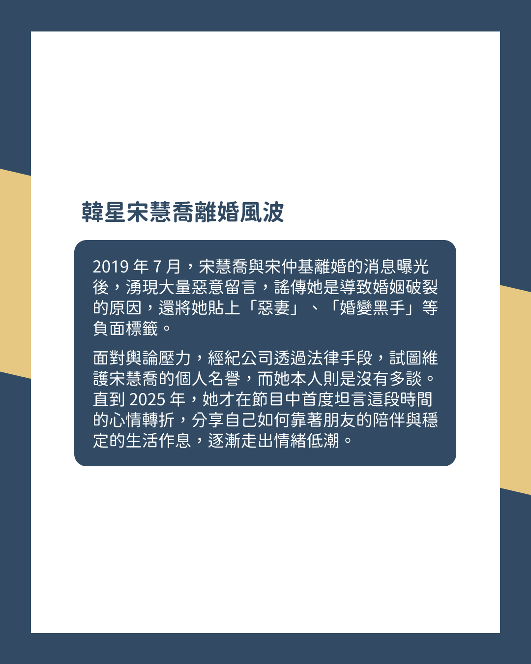 2019年7月,宋慧喬與宋仲基離婚的消息曝光後,湧現大量惡意留言,謠傳她是導致婚姻破裂的原因,還將她貼上「惡妻」、「婚變黑手」等負面標籤。