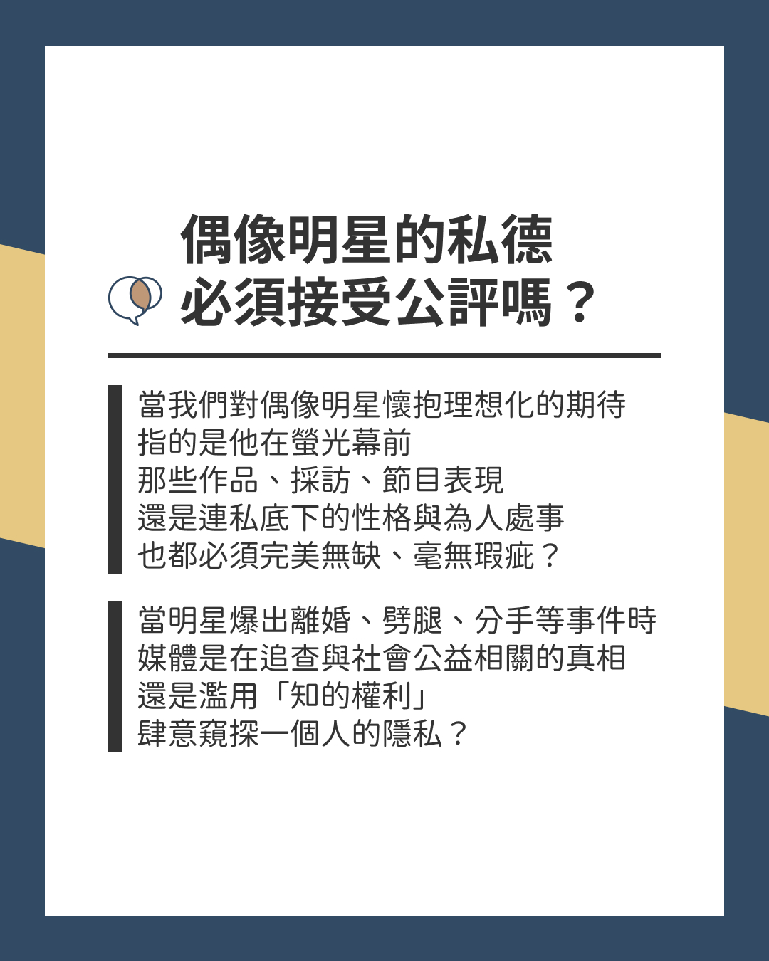 當偶像明星爆出離婚、劈腿、分手等事件時,媒體真的是在追查「與社會公益相關」的真相,還是濫用「知的權利」,肆意窺探一個人的隱私?