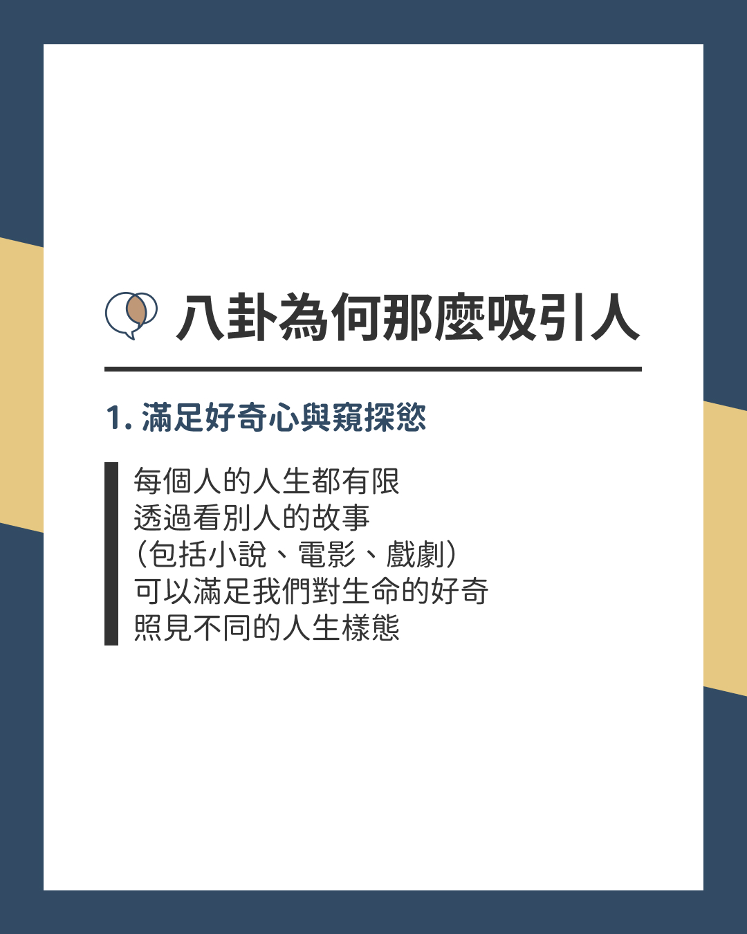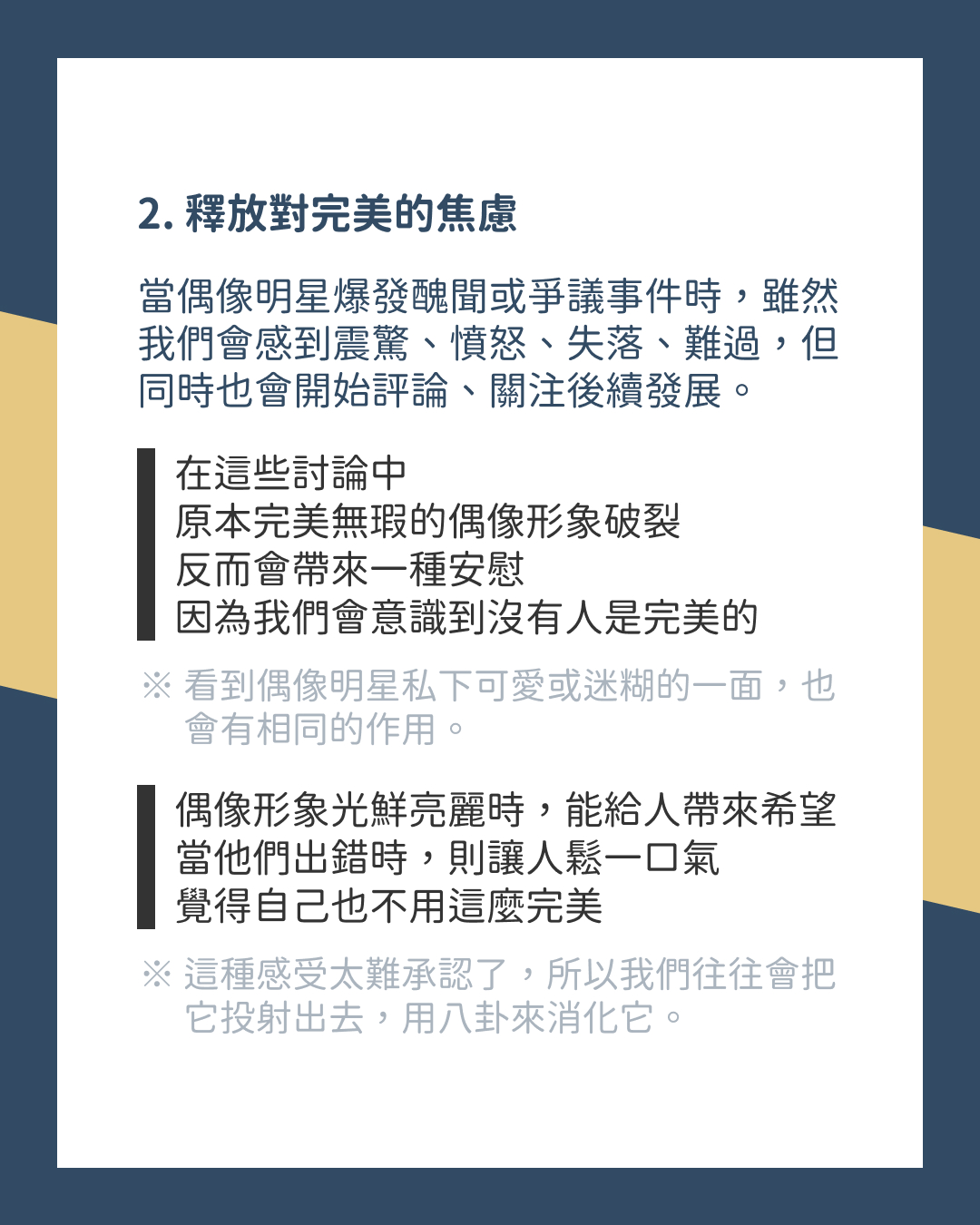 面對八卦,會讓人產生又愛又恨的矛盾感:當偶像形象光鮮亮麗時,能給人帶來希望;當他們出錯時,則讓人鬆一口氣,覺得自己也不用這麼完美。不過這種感受太難承認了,所以我們往往會把它投射出去,用八卦來消化它