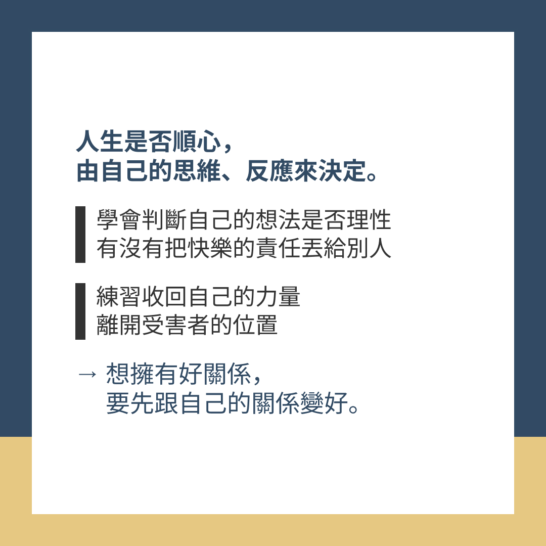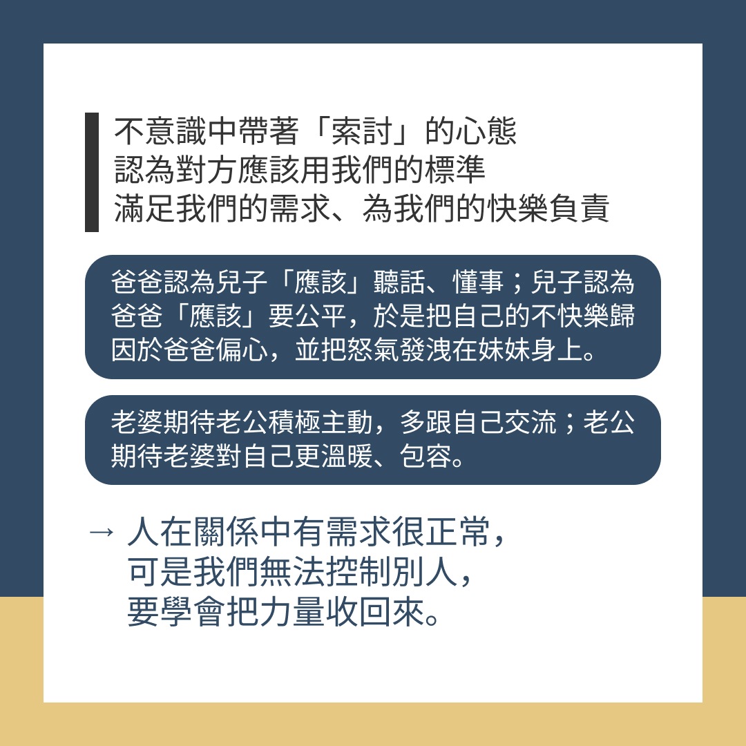 → 人在關係中有需求很正常,可是我們無法控制別人,要學會把力量收回來。