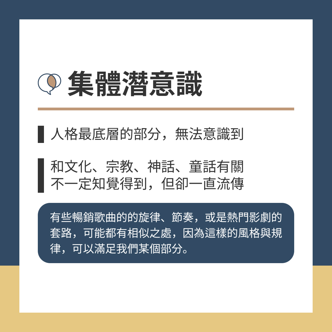 榮格曾用島做比喻,露出水面的小島,是人能感知到的意識;潮汐運動發生,會顯露出來的部分是個人潛意識;水底下與其他陸地相連的,是集體潛意識。