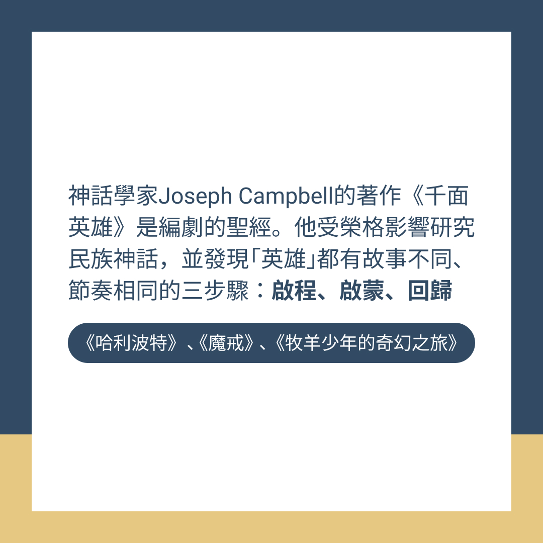 神話學家喬瑟夫‧坎貝爾的著作《千面英雄》,成為編劇的聖經,他受榮格影響研究許多民族神話,並發現「英雄」都有故事不同、節奏相同的三步驟:啟程、啟蒙、回歸(例:《哈利波特》、《魔戒》、《牧羊少年的奇幻之旅》)。