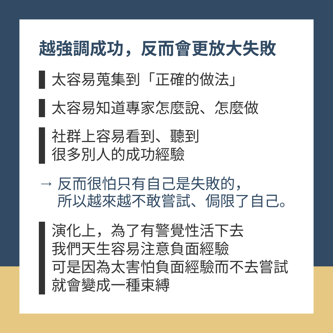 現代人太容易蒐集到「正確的做法」,也太容易知道專家怎麼說、怎麼做,加上人們在社群會看到、聽到很多別人的成功經驗,反而很怕只有自己是失敗的,所以越來越不敢嘗試、侷限了自己。