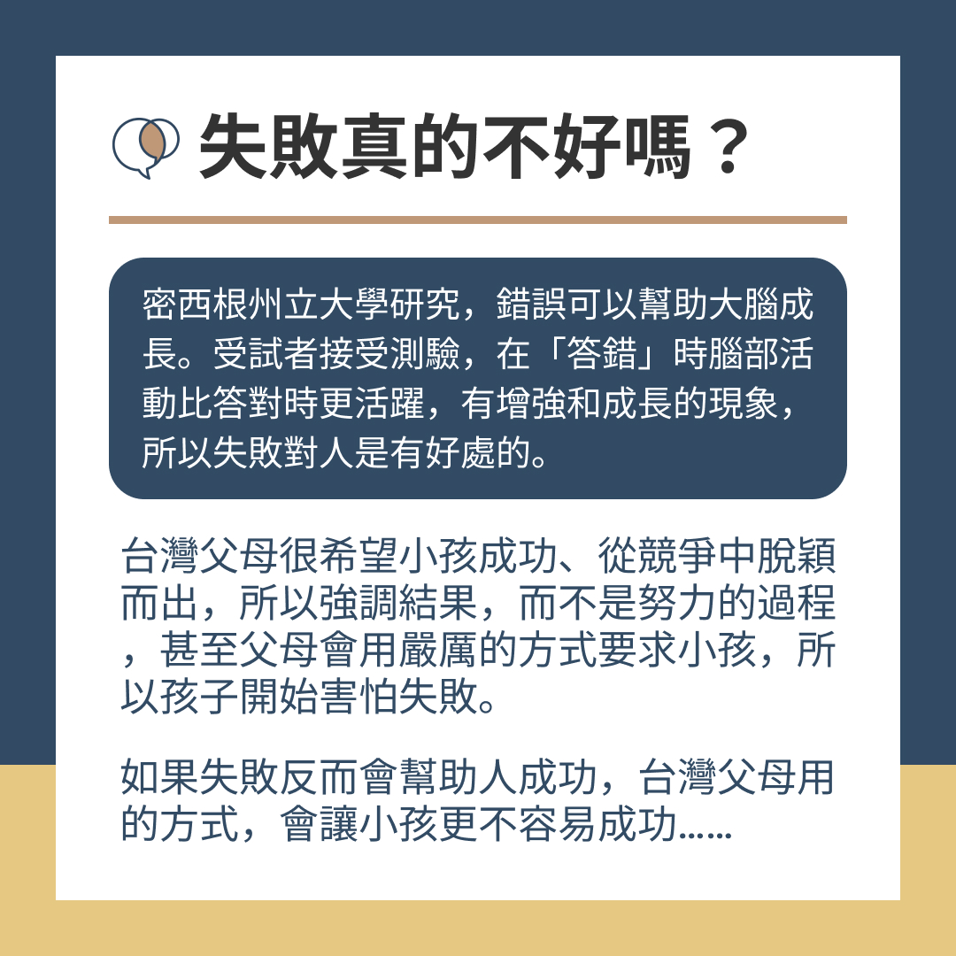 台灣父母很希望小孩成功、從競爭中脫穎而出,所以強調結果,而不是努力的過程,甚至父母有時會用嚴厲的方式要求小孩,所以孩子開始害怕失敗。如果失敗反而會幫助人成功,台灣父母用的方式,會讓小孩更不容易成功。
