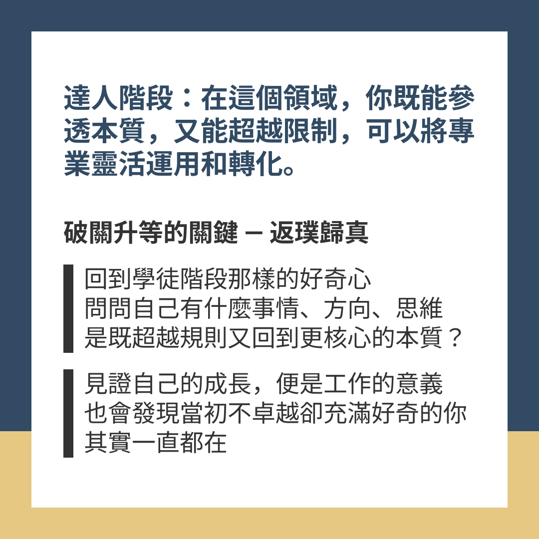 達人階段:在這個領域裡,你既能參透本質,又能超越限制,可以將專業靈活運用和轉化