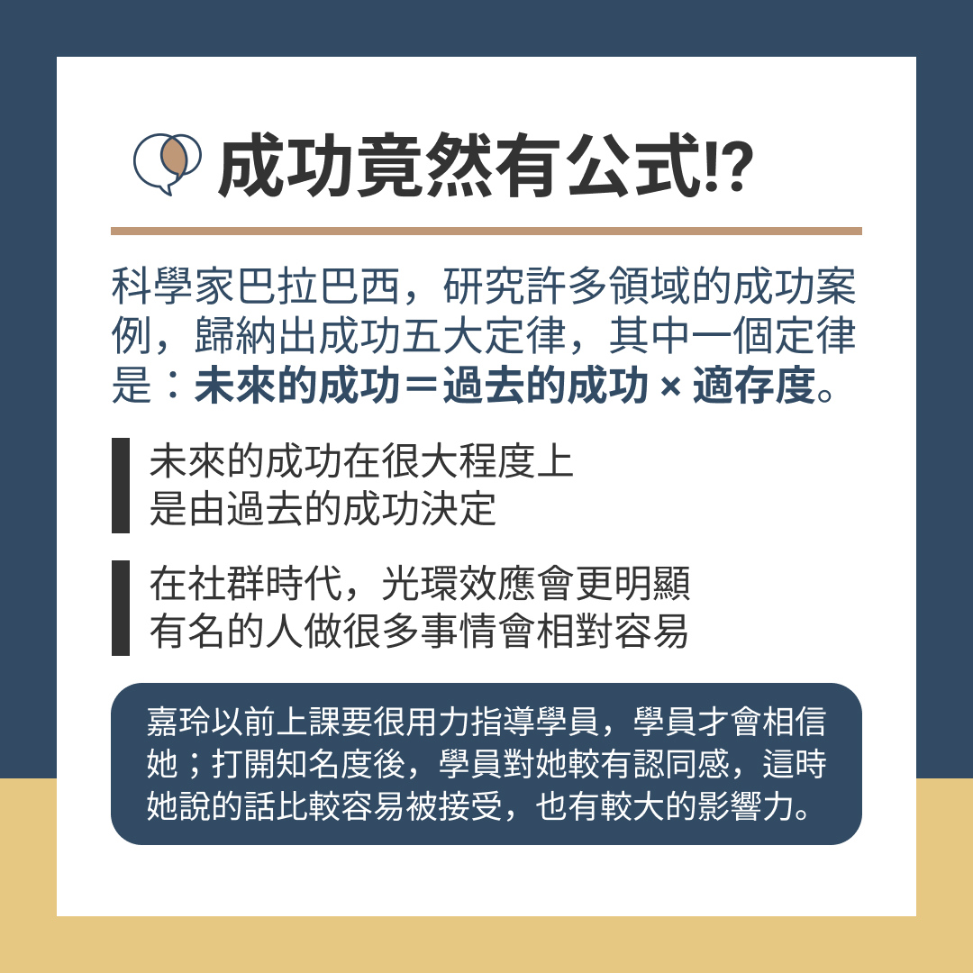 「成功為成功之母」是提醒我們,運用自己所累積的經驗跟能力,會幫助你更容易取得下一次的成功