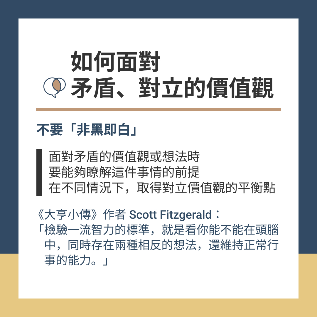 面對矛盾的價值觀或想法時,要能夠瞭解這件事情的前提,在不同的情況下,取得對立價值觀的平衡點