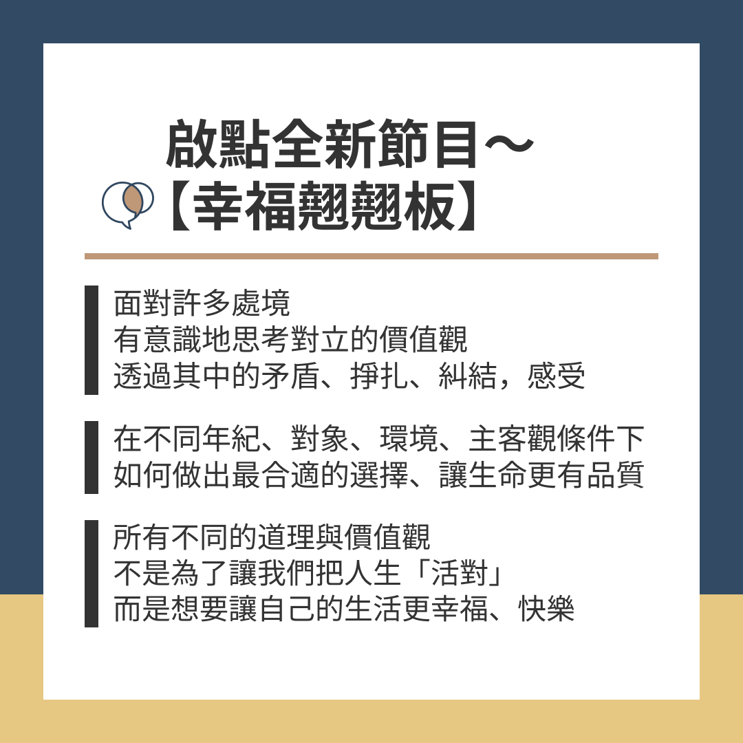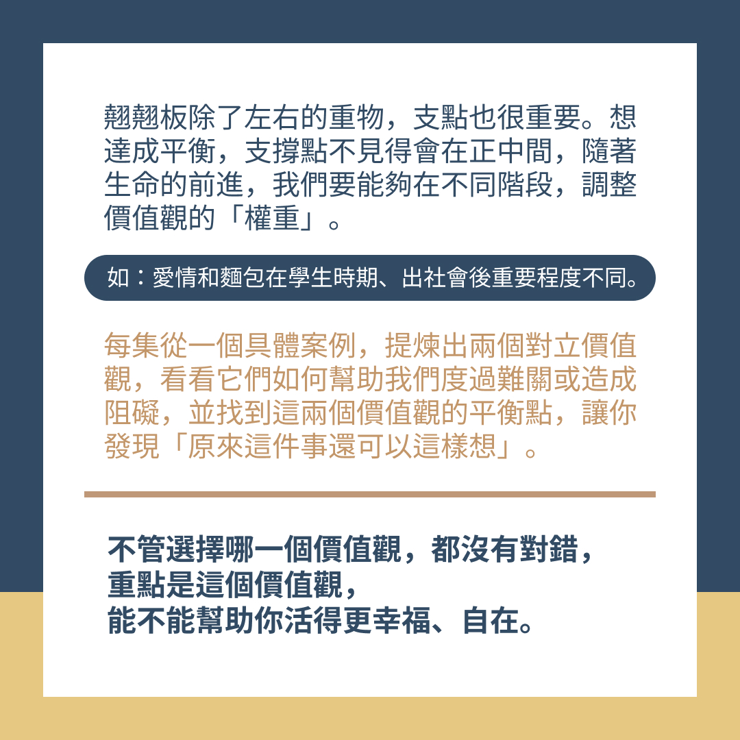 收聽【幸福翹翹板】:每集內容都會從一個具體案例中,提煉出兩個對立的價值觀,看看它們在人生路上,是如何幫我們度過難關或造成阻礙,並且為這兩個價值觀找到平衡的「支點」,讓你發現「原來這件事還可以這樣想」。