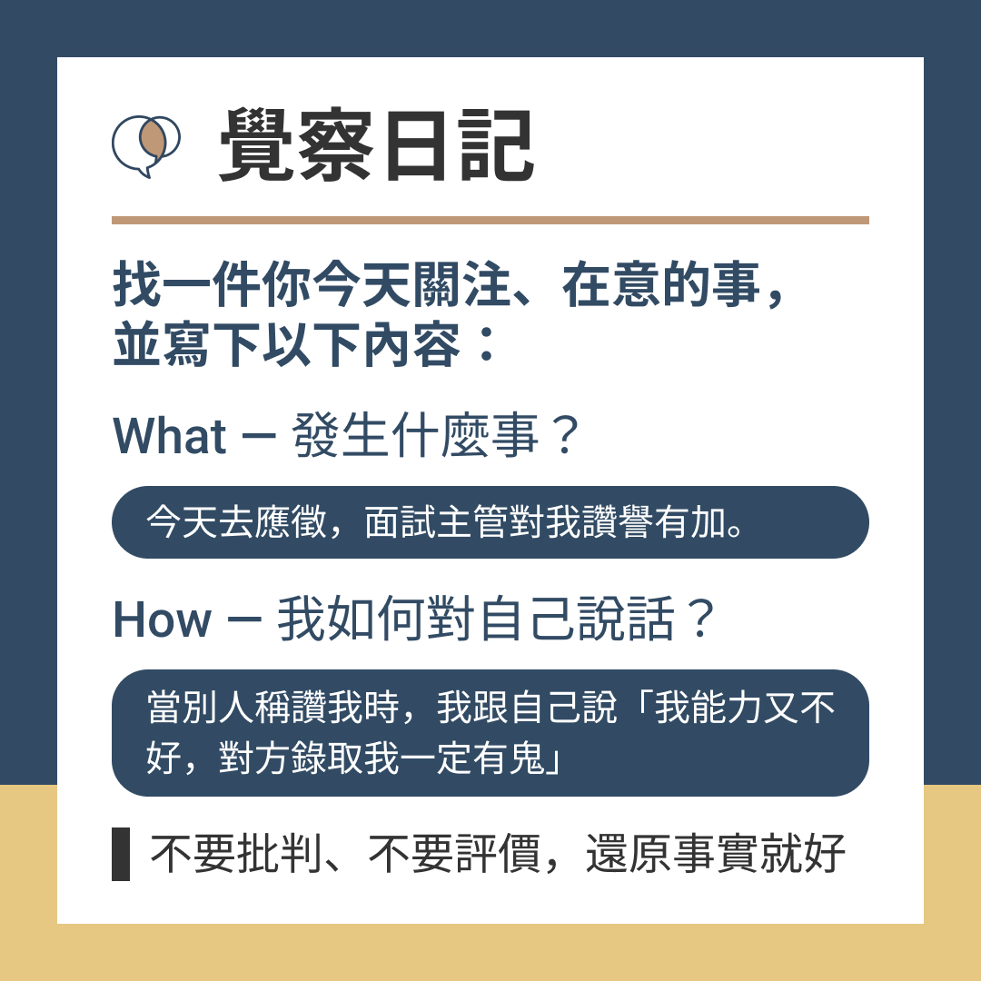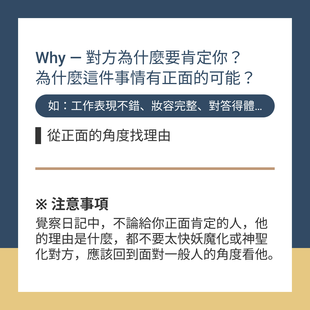 ※ 注意事項:覺察日記中,不論給你正面肯定的人,他的理由是什麼,都不要太快妖魔化或神聖化,回到面對一般人的角度看對方