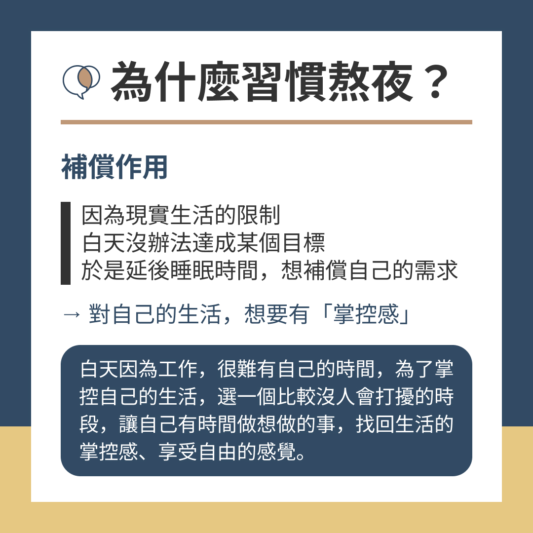 白天因為工作、家務,很難有自己的時間,為了掌控自己的生活,我們會把焦點放到睡覺時間,選一個比較沒人打擾的時段,讓自己有時間做想做的事,藉此找回生活的掌控感、享受自由的感覺。