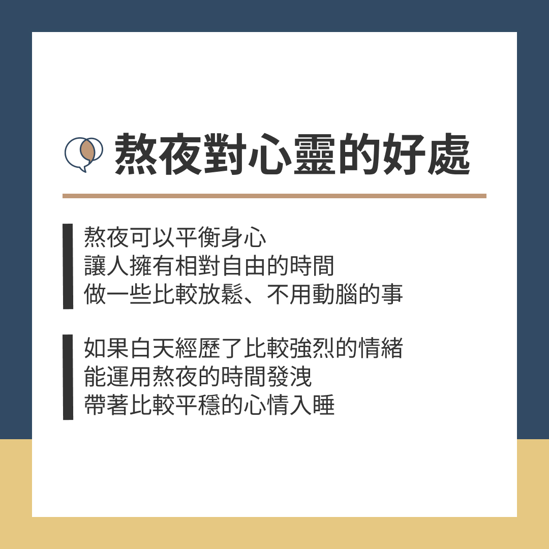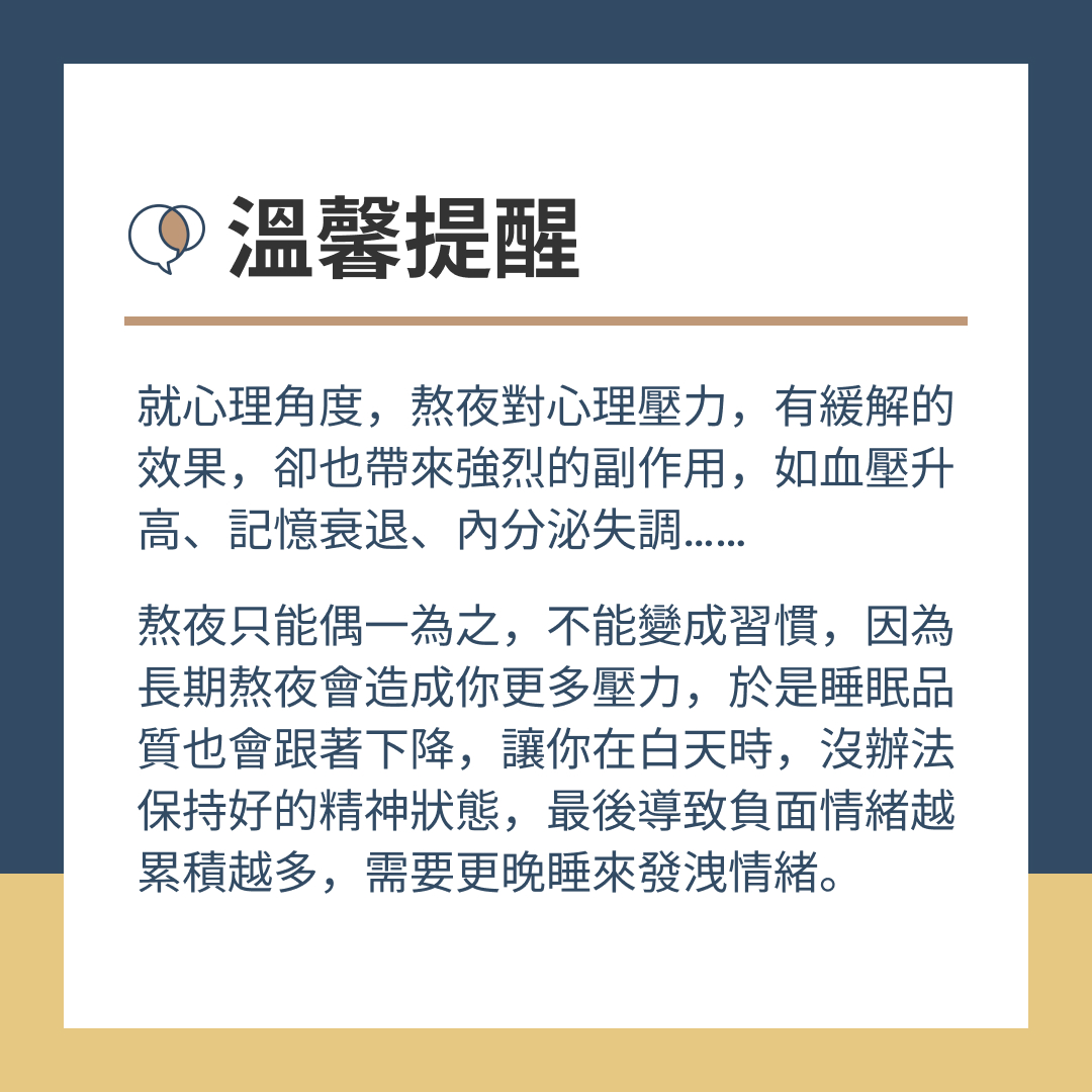 ※ 熬夜只能偶一為之,不能變成長期的習慣,因為長期熬夜會造成你更多壓力,於是睡眠品質也會跟著下降,讓你在白天時,沒辦法保持好的精神狀態,最後導致負面情緒越累積越多,需要更晚睡來發洩情緒。