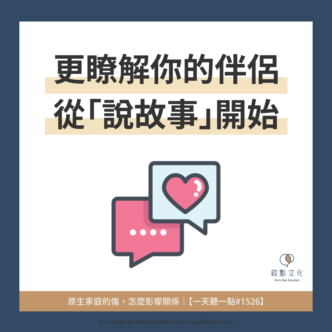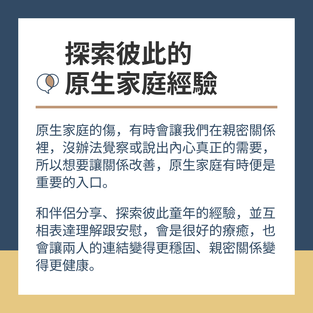 原生家庭的傷,有時會讓我們在親密關係裡,沒辦法覺察或說出內心真正的需要,所以想要讓關係改善,原生家庭有時便是重要的入口。和伴侶分享、探索彼此童年的經驗,並互相表達理解跟安慰,會是很好的療癒,也會讓兩人的連結變得更穩固、親密關係變得更健康。