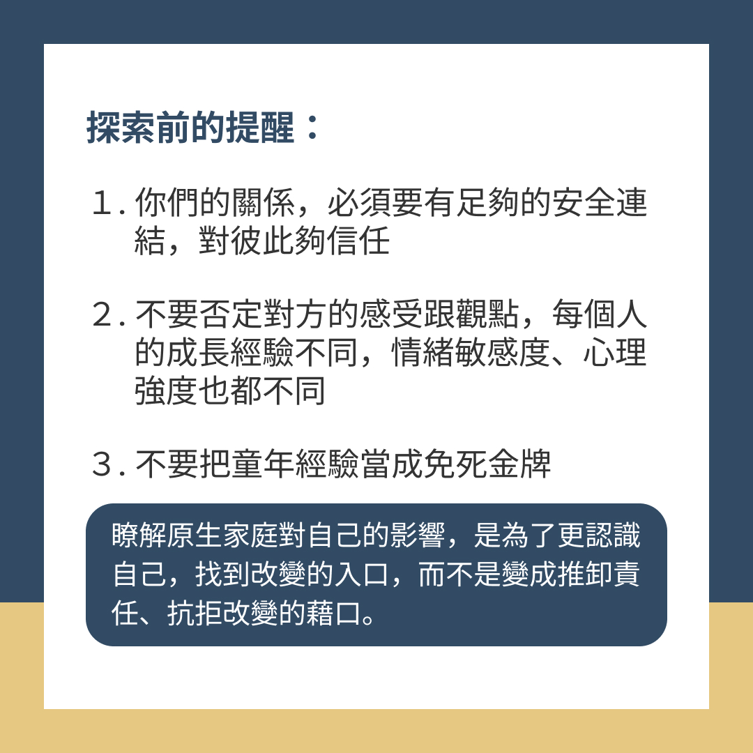 原生家庭會對人的想法、行為產生影響,但不代表在關係中的任何衝突,都是家庭造成的,而沒有自己的責任。了解原生家庭對自己的影響,目的是為了更認識自己,找到改變的入口,而不是變成推卸責任、抗拒改變的藉口。