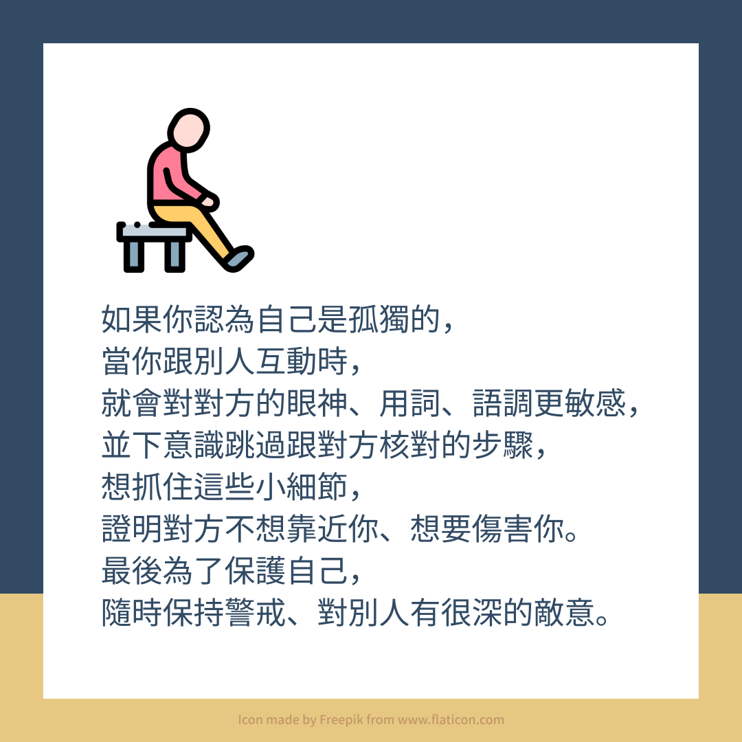 如果你認為自己是孤獨的,當你跟別人互動時,就會對對方的眼神、用詞、語調更加敏感,並下意識跳過跟對方核對的步驟,想抓住這些小細節,證明對方不想靠近你、想要傷害你,最後為了保護自己,隨時隨地保持警戒、對別人有很深的敵意