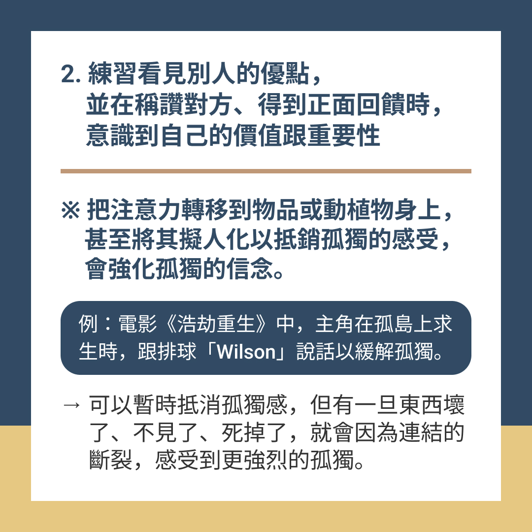 ※ 把注意力轉移到物品或動植物的身上,甚至將它們擬人化,抵銷孤獨的感受,會強化孤獨的信念。