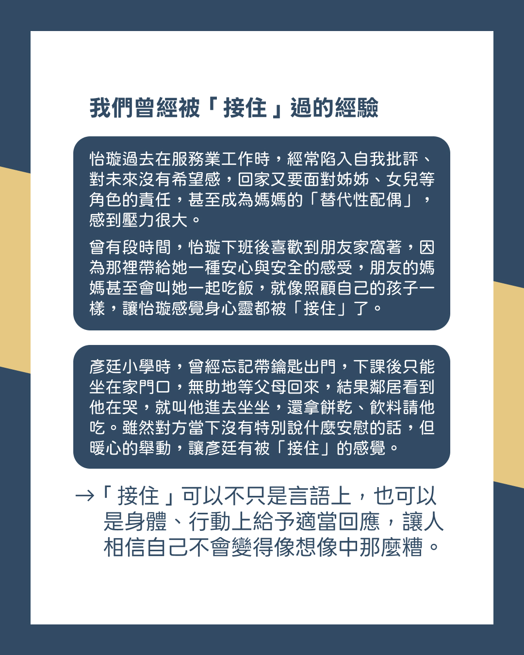 可以是指情緒、身理需求的承接,也可以是物理上快跌倒,被人扶一把的時刻